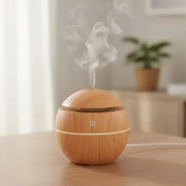Humificador esférico simil madera. Tiene 200ml de capacidad. Incluye un filtro y un cable de carga USB. Mide 10cm de alto x 10cm de ancho.
