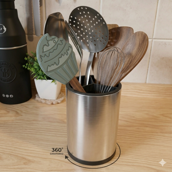 Organizador y escurridor de utensillos giratorio. Superficie de acero inoxidable.