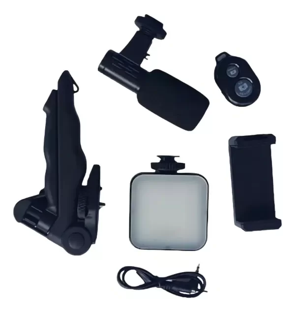 luz LED blanca, micrófono grande de calidad, soporte universal para celulares y control remóto.