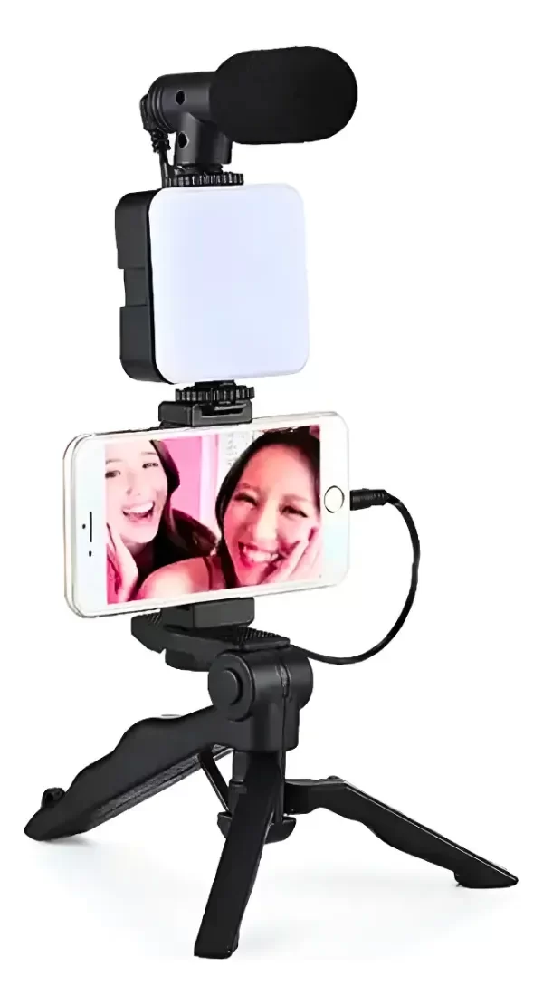 Kit de grabación super completo. Incluye un trípode estabilizador que puede utilizarse sosteniendolo con las manos o extendiéndolo sobre una superficie,